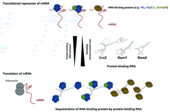 Regulation by protein-binding RNAs. Protein-binding RNAs (e.g., CrcZ, RsmY/Z) are activated by environmental cues. They contain multiple binding sites for RNA-binding translational repressors (top; Hfq (blue hexamer), Hfq in conjunction with Crc (blue hexamer/green circle), RsmA/N (brown circles)). This leads to sequestration of the RNA-binding proteins and to de-repression of their target mRNAs (bottom).