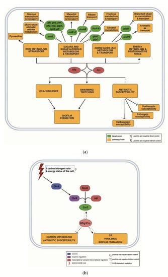 - Coggan, K.A.; Wolfgang, M.C. Global regulatory pathways and cross-talk control Pseudomonas aeruginosa environmental lifestyle and virulence phenotype. Curr. Issues Mol. Biol. 2012, 14, 47–70. [Google Scholar]