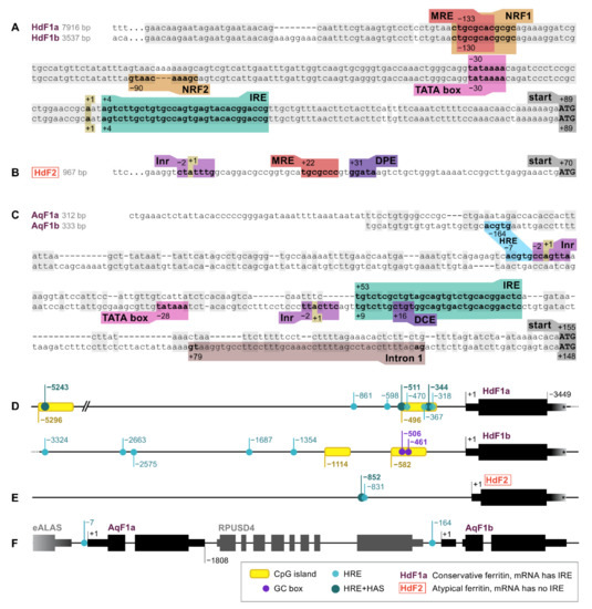 RNA and DNA regulatory elements in the ferritin genes of H. dujardini (HdF1a, HdF1b, and HdF2) and A. queenslandica (AqF1a and AqF1b). (A–C) 5′ sequences of sponge ferritin genes. (D–F) Arrangement of sponge ferritin gene copies, CpG islands, Hypoxia response elements (HRE) and Hypoxia ancillary sequences (HAS). 3′UTR lengths of H. dujardini ferritins are only shown schematically since unlike the 5′UTRs they have not been experimentally confirmed; the assembled transcripts are longer than depicted in the figure (Supplementary Table S1). MRE, metal regulatory element; IRE, iron-responsive element; Inr, initiator of transcription; DPE, downstream promotor element; DCE, downstream core element. See Supplementary Table S2 for motif sequences and other details.