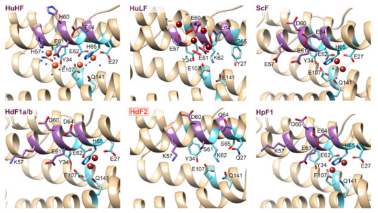 3D structures of the regions corresponding to ferroxidase di-iron center (cyan) and nucleation site (purple) of H. sapiens ferritins HuHF and HuLF (PDB IDs: 4OYN, 5LG8), bivalve Sinonovacula constricta ScF (PDB ID: 6LP5), and sponges H. dujardini and H. panicea ferritins. Sponge ferritins’ structures are modeled with SWISS-MODEL server [41] using ScF as a template. Molecular graphics was prepared using UCSF Chimera software [42]. Orange and brown spheres represent Fe3+ and Fe2+ ions, respectively. Amino acids numbers correspond to conventional human HuHF numbering starting after the initial methionine.