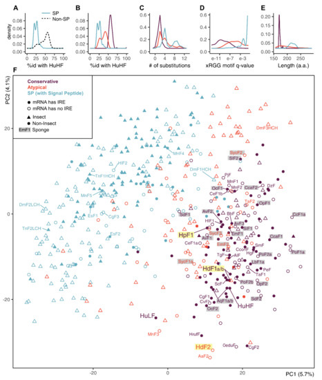 Principal component analysis (PCA) plot on a set of animal ferritins built using 474 sequence features selected by unsupervised algorithms. (A,B) Distribution of identity percentages with HuHF in ferritins of two classes of SP and SP-less ferritins and after dividing SP-less ferritins into conservative and atypical classes. (C–E) Distributions of the number of replacements in the three functional domains, the xRGG motif q-value, and protein sequence lengths in the ferritins of three classes. (F) PCA plot of 533 analyzed invertebrate and human ferritin sequences (Supplementary Table S1) built by selected feature subset (474 out of 6567 sequence features combined from top-100 features selected by five unsupervised feature selection algorithms, see Section 4, Supplementary Table S4) and showing prior class labels. Sponge ferritins are highlighted with grey, H. dujardini and H. panicea ferritins are highlighted with yellow. The large version of this plot with all the labels is shown in Supplementary Figure S2.
