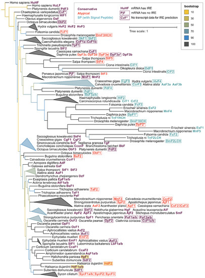 The SP-ferritins have low identity to human HuHF (Figure 4A). The SP-less ferritins generally have higher identity to HuHF, but the distribution of identity levels is skewed, suggesting non-uniform conservation and the presence of infraclasses. We defined two such infraclasses of SP-less ferritins, conservative and atypical (the atypical is defined as having less than 49% sequence identity with HuHF or more than five amino acid replacements in the three functional domains) (Figure 4B,C). The atypical ferritins occupy an intermediate position between the conserved non-SP ferritins and SP-ferritins in terms of the identity levels with HuHF, the xRGG motif enrichment, and the sequence length (Figure 4B–E). The proportion of conservative and atypical classes in analyzed ferritins differs for insects (8% and 23%) and other invertebrates (57% and 18%). In sponges, atypical ferritins are represented by HdF2 (37.7% identity with HuHF and 8 replacements), E. muelleri EmF2 (46.4% id; 9 repl.), and all S. ciliatum ferritins: SycF1a/b, SycF2, SycF3 (44.3–45.4% id; 2–3 repl.). Nearly all atypical ferritins lack iron-responsive element (IRE), the few exceptions can be considered as marginal cases of conservative ferritins (47–49% id; 2–3 repl.). The overall level of IRE presence is 47% for non-insect and 29% for insect ferritins. IREs are mostly found in the ferritin classes with the largest representation in the group: 63% of conservative ferritins outside of insects, and 41% of insect SP-ferritins (Supplementary Table S1, sheet Statistics).