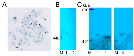 Ferritin complexes in sponges H. dujardini and H. panicea. (A) The ferric complexes detected in H. dujardini cells by Prussian blue staining. (B,C) Sponge cell extracts fractionated by native electrophoresis in polyacrylamide gel: staining with Prussian blue (B) and the UV 360 nm absorbance (C). Specimens of H. panicea collected in Autumn (1) and Summer (3). Specimens of H. dujardini collected in Autumn (2) and Summer (4). M, horse ferritin (440 kDa) and thyroglobulin (670 kDa).