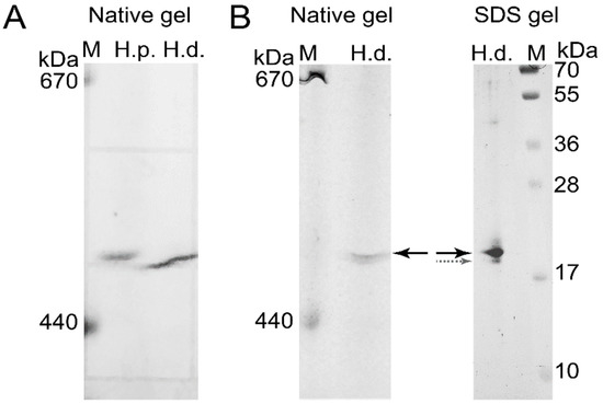 To confirm the presence of H. dujardini and H. panicea ferritins in the high molecular mass complexes detected in native gels, the corresponding bands were cut from the native gel stained with Coomassie blue without fixation (Figure 7A) and then analyzed by MALDI/TOF mass spectrometry. The HpF1, HdF1a/b, and HdF2 ferritins were identified in these bands (Supplementary Table S10, Supplementary Figure S8). In addition, the ferritin band of H. dujardini (specimens collected in Summer) was cut from the native gel (Figure 7B), denatured in SDS-containing buffer and analyzed by the SDS-12% PAGE electrophoresis followed by Coomassie staining. One major band of approximately 20 kDa was revealed (Figure 7B) that well corresponds to a predicted molecular mass of HdF1a/b equal to 19.4 kDa. The MALDI/TOF mass spectrometry confirmed the presence of HdF1a/b in this band. The minor band of approximately 19 kDa that resolved by this analysis (Figure 7B) corresponds to H. dujardini neuroglobin (QEH04777.1, Supplementary Table S10).