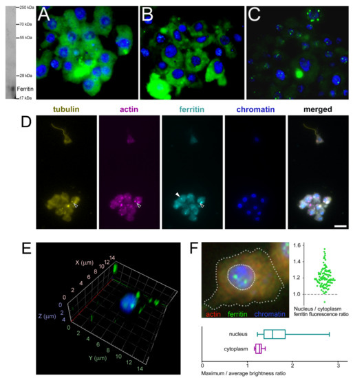 Subcellular localization of ferritin in H. dujardini cells. (A–C) Ferritin immune staining. Ferritin (green), Chromatin (blue). Western blot on the right shows the antibody specificity. Staining of cells collected at the end of sponge growth in Autumn (A), and at the beginning of sponge growth in Summer (B,C). The focal planes of maximum intensity presented. (D) Sponge cells, quadruple stained for tubulin, actin, ferritin and chromatin. Black arrows, cytoplasmic ferritin colocalized with both tubulin and actin; white arrow, cytoplasmic granule of ferritin without visible signs of colocalization with cytoskeletal proteins. Scale bar 10 μm. Confocal microscopy of intranuclear ferritin in the isolated nuclei, 3D reconstruction. (E) Ferritin (green), Chromatin (blue). Intranuclear ferritin granules are co-purified together with nuclei. (F) Sponge cell, triple stained for actin, chromatin and ferritin (dashed lines denote boundaries of the cell and the nucleus). Swarmplot shows the ratio of average fluorescence levels between ferritin localized in the nucleus and in the cytoplasm of each cell, N = 114. Boxplot compares the ratio of the maximum to the average fluorescence level of ferritin localized in the nucleus and in the cytoplasm of each cell, N = 114.