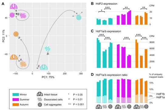Expression of ferritin genes during the dissociation/reaggregation processes in sponge H. dujardini during the different periods of the annual cycle. (A) Principal component analysis (PCA) plot of RNA-Seq samples colored by the life cycle stages (Winter, cyan; Summer, purple; Autumn, orange) and marked by the pictograms of the stages of the dissociation/reaggregation experiment. (B,C) Ferritin HdF2 and HdF1a/b transcript expression in CPM (calculated by edgeR after normalization), each bar represents one replicate. Statistical significance is shown for BH-adjusted p-values of the t-test carried out for replicates of each period. Since the HdF1a and HdF1b copies are nearly identical, their expression is shown in total (reads were mapped to one transcript). (D) Stacked barplot showing the percentage of the reads mapped uniquely to HdF1a (light boxes) or HdF1b (dark boxes) gene copy, out of the total number of reads mapped to these copies, that could be used as an estimate for the transcriptional ratio between two copies.
