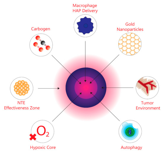 One of the most difficult barriers encountered when treating the majority of solid tumours is attributed to the scattered microregions within the tumour characterized by the lack of oxygen. This is known as tumour hypoxia [1]. In order to maintain functionality within normal tissues, such as excreting metabolic waste, oxygen must be supplied through existing vasculature systems [2,3,4]. During the early stages of tumourigenesis, prior to rapid tumour cell proliferation, tumours use existing vasculature systems for oxygen supply in order to maintain the same metabolic demands as normal tissues [2,5,6]. However, as tumour development continues, these cells begin to proliferate rapidly, leading to a sharp increase in size and mass [1,7,8]. Consequently, rapid tumour growth results in an increased demand for oxygen to supply the tumour cells; however, the body does not have the adequate oxygen supply to meet the heightened demands [1,7,8]. Furthermore, as the tumour continues to enlarge, there is an increase in the distance between tumour cells and existing vasculature [1,7,8]. In response to the increased distance, tumours will use the existing vasculature to develop an independent vasculature system through the process of angiogenesis [2,5,6]. However, the newly formed vasculature is severely flawed both on a structural and functional level, and this impairs the supply of oxygen to tumour cells that require oxygen to satisfy metabolic demands [2,3,4]. Moreover, the lack of oxygen supply results in hypoxic microregions scattered throughout the tumour relative to normal tissue [1]. The hypoxic environments within tumours create several cancer treatment barriers. Most notably, all hypoxic cells are resistant to ionizing radiation (IR) [9,10,11]. The mechanism by which radiation is able to eradicate tumour cells by damaging DNA, resulting in apoptosis and cell death, occurs through the production of reactive oxygen species (ROS) [12,13]. However, due to the limited oxygen availability within hypoxic tumour microenvironments, this impedes the efficacy of radiotherapy [12,14]. Furthermore, normal tissues are unable to withstand increased doses of radiation that compensate for tumour hypoxia [12]. As tumour hypoxia and normal tissue radiation dosage limitations have prevented effective radiotherapy, Hall and Giaccia [15] have outlined four methods targeting tumour hypoxia through radiosensitizing hypoxic cells. These include hyperbaric oxygen, hypoxic cell radiosensitizers, hypoxic cytotoxins, and tumour metabolism. However, as research continues to elucidate the relationship between tumour hypoxia and radiotherapy, novel approaches have been developed. This review outlines four emerging approaches for targeting and radiosensitizing hypoxic cells, namely, guided carbogen breathing through tumour hypoxia imaging (i.e., PET), which increases the oxygen levels in targeted hypoxic areas, gold nanoparticles, macrophage-mediated drug delivery, and autophagy inhibitors, which result in the removal of hypoxic cells. Particularly, these novel methods improve the therapeutic ratio between hypoxic tumour microenvironments and normal tissue, thus, increasing the efficacy of anticancer therapeutics. The review also focuses on non-targeted effects (NTE) and considers the possibility that rather than trying to sensitize hypoxic cells, we could try to protect normal tissues from low-dose collateral effects by inhibiting or reducing bystander effects, which signal p53 competent cells to undergo apoptosis or other forms of cell death [16,17]. The novel methods and targets are shown in graphic form in Figure 1.