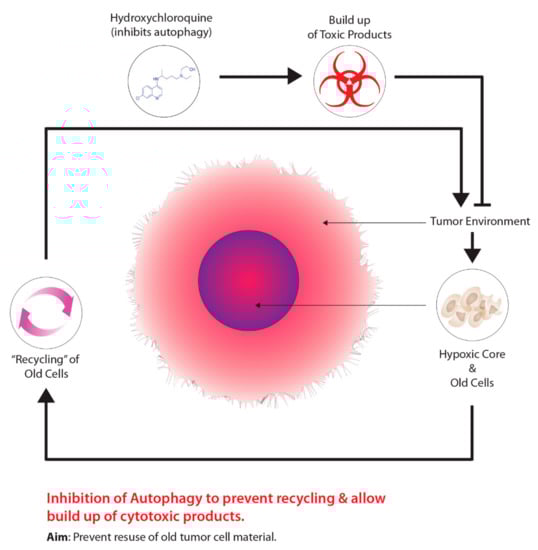 Another method is the use of drugs that target tumour metabolism. Tumours demonstrate a growth advantage through a shift in metabolism, specifically, from oxidative phosphorylation to glycolytic metabolism, which is driven by HIF-1–pyruvate dehydrogenase kinase 1 (PDK1) [127]. Consequently, the shift in metabolism causes tumours to conserve oxygen supplies and induces a compensatory response by increasing glycolysis through the reduction of mitochondrial processes [127]. Moreover, the inhibition of PDK leads to an increase in tumour hypoxia [127]. Researchers have demonstrated that dichloroacetate (DCA) acts as a PDK inhibitor, increasing mitochondrial functioning within tumours, thus, resuming oxidative metabolism similar to normal tissues [128]. Aside from targeting the transition from oxidative phosphorylation to glycolytic metabolism, other cancer therapeutics targeting autophagy, another molecular process aiding in tumour metabolism, has been garnering recent attention. The overall concept for this approach is outlined in Figure 5. The process of autophagy in relation to cancer involves the degradation of damaged cellular components that are recycled to meet the metabolic demands of cancer cells [129]. Mizushima and Komatsu [130] suggest that low baseline levels of autophagy are essential for preventing toxicity in tissues by preventing the build-up of damaged proteins and organelles. Autophagy is characterized as a “double-edged sword”, primarily due to its dual role in tumourigenesis serving as a tumour suppressor and tumour promotor, depending on the type of tissue and stage of the tumour [129]. Several studies on human prostate, breast, and ovarian cancers, displayed partial monoallelic loss in one essential autophagy gene, ATG6/Beclin-1 [129,131,132,133]. Furthermore, the impairment of proper autophagy functioning in tumours serves as a signal for identifying cancer [134]. Research has also suggested that autophagy acts as a tumour promoter due to growth enhancement and survival capabilities [135]. As previously mentioned, hypoxic tumour environments are severely lacking in metabolic requirements due to primitive vasculature systems; however, autophagy serves to meet metabolic demands through the recycling of intracellular components [135,136,137]. Normally, when damaged or old cells are removed through autophagy, there is a release of structural biological components, such as amino acids, nucleotides, and fatty acids [138]. Furthermore, these intracellular components can be recycled and used for tumour metabolic demands; however, suppressing autophagy through the partial deletion of the Beclin-1 gene leads to increased cell death [135]. Current preclinical studies have determined that inhibiting autophagy has improved cancer patient outcomes [139]. At present, the only autophagy inhibiting drugs viable for clinical studies are chloroquine (CQ) and hydroxychloroquine (HCQ), a derivative of CQ.