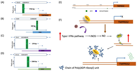 Binding sites of PARP1 on promoter or downstream regions of different immune-regulatory genes. PARP1 binds to TMPRSS2, IFNβ, and JAK/STAT pathway genes either upstream or downstream to TSS. These PARP1 binding sites were reported by Lodhi et al. 2014 [37] and derived from their ChIP-seq data. Chromosome numbers and PARP1 binding locations are indicated in each figure. (A). PARP1 binds to about 7.7 kb upstream to TSS of TMPRSS2. (B). PARP1 binds just 182 bp downstream to TSS IFNβ promoter. (C). PARP1 binding to STAT1 promoter in the upstream region at 279 bp; it is not known how PARP1 is involved in the transcription regulation of this gene. (D). There is a PARP1 binding site in the upstream region around 1.5 kb promoter of STAT2. (E). Using www.interferome.org, we generated transcription binding sites in the promoter region of TMPRSS2, which has been developed using interferome (www.interferome.org). The location of transcription factors on each of the genes from the region spanning −1500 bp to +500 bp from the start site. Each coloured box represents a specific transcription factor, the key for which is provided below the graphic. TRANSFAC* predicted a match between the transcription factor and its predicted binding [34]. (F). Induced enzymatic activity of PARP1 auto-poly(ADP-ribosyl)ates, subsequently followed by SARS-CoV-2 infection. Virus internalization through ACE2 receptors and priming of viral S protein by residual TMPRSS2. TLR3/7 recognizes the PAMPs and induces the type I IFN pathway, which leads to the production of iNOS and, therefore, NO. Increase of NO creates ROS in cells, which causes DNA damage and a reason for PARP1 activation. Auto-poly(ADP-ribosyl)ated PARP1 moves away from the binding site, and it may increase the transcription of TMPRSS2, hence facilitating virus entry.