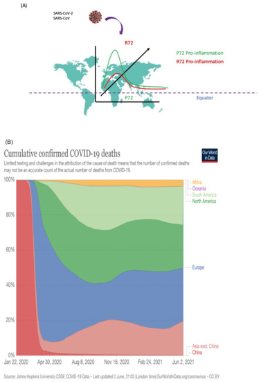 Its cellular function also includes orchestrating the cell response to a broad range of stresses including immune response to bacterial or viral infections, oncogenic, genotoxic, and nutritional stresses. As a nuclear protein and transcription factor, p53 is evolutionarily conserved across Drosophila to human and plant and activates or downregulates the transcription of target genes that are responsible for many cellular responses against different cell insults. In human populations, several studies reported that SNP at codon 72 of p53 affects cell response to nutritional deprivation, immune response, and mice ageing [77,78,79]. It is well known that the effect of change in nucleotide at second position of codon 72 at exon 4 (rs1042522—CCC to CGC) resulting in a substitution of proline (Pro, P) to arginine (Arg, R) in the P-rich region domain of p53 [80]. Interestingly, the arginine 72 variant (R72) and proline 72 variant (P72) allele frequencies vary in different ethnic populations and geographic regions of earth at the equator or latitudinally. The P72 allele is more frequent in the human population near the equator, whereas R72 is more frequent in a linear manner with latitude (Figure 4A). In an estimate, about 64% of African-Americans and 58% of Hispanic-Americans express the P72 variant. Conversely, only 32% of White Americans have the P72 variant, in which 10% are homozygous to this allele. The human population that lives near the equator is about 40% homozygous for P72, and this percentage drops higher up longitudinally and R72 frequency increases in people [81]. Of the 13 countries that lie on the equator, 7 are in Africa—the most of any continent—and South America is home to 3 of the nations. The remaining countries are island nations in the Indian and Pacific oceans. Countries intersected by the equator experience much warmer temperatures and are more humid year-round than the rest of the world, making them vulnerable to many infectious diseases including influenza, cholera, malaria, tuberculosis, and respiratory diseases.