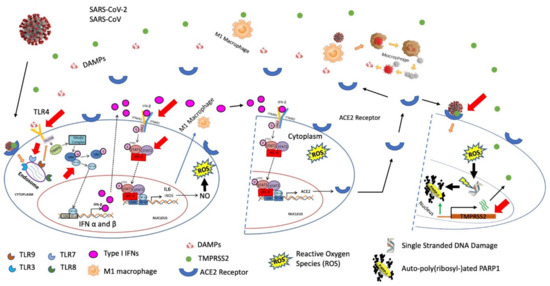 The type I IFN pathway plays a central role against virus infection by the host innate immune response, which leads to increased expression of ISGs and cytokine production to promote proinflammatory response against viruses [116,117,118]. Simultaneously, TMPRSS2 expression is initiated by auto-poly(ADP-ribosyl)ation of PARP1 (Figure 2F). This enzymatic activation of PARP1 is caused by ssDNA damage by induction of reactive oxygen species (ROS) in viral/bacterial infected cells. ROS is induced by exponentially expression of iNOS and production of nitric oxide (NO). Auto-poly(ADP-ribosyl)ated PARP1 positively controls the TMPRSS2 expression and facilitates viral entry into target cells by viral S protein priming.