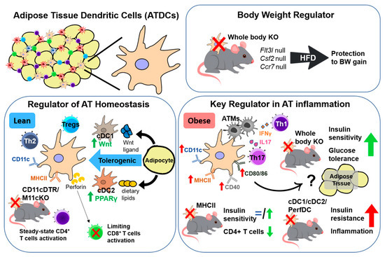 The AP function of ATDCs is considered the primary pathway that regulates obesity-induced inflammation. A number of studies showed that deletion of AP genes such as MHC-II, CD40L, and CD80/CD86 lead to marked changes in obesity-induced inflammation and insulin resistance [58,59,60,61,62]. However, since AP can also be performed by other APCs in addition to ATDCs [57], a direct and specific ATDC depletion model should be considered to elucidate the AP function of ATDCs in obesity. To this end, Lumeng groups developed MHC-IIfl/fl Itgax-Cre (M11cKO) and MHC-IIfl/fl Lysm-Cre (MMKO) mice as putative ATDC- and ATM-specific MHC-II knockout models [12,33]. Regarding the obesity-induced AT inflammation, both M11cKO mice and MMKO mice showed decreased CD4+ T cells. The reduction of TCR expression and lower frequency of effector/memory CD4+ T cells were also observed in M11cKO and MMKO mice, respectively. These results support the existence and the importance of APC function of ATDCs in obesity-induced AT inflammation.