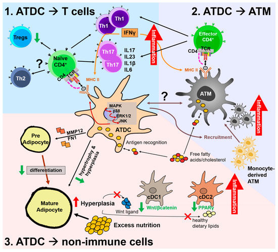 Collectively, ATDCs interact with Th2/Treg in lean AT and potentially induce Th1 and Th17 proliferation in obesity. It remains unclear how ATDCs can play the tolerogenic or immunogenic functions depending on environmental cues or whether specific ATDC subsets have certain different functions.