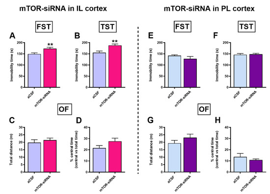 We examined the role of mTOR knockdown in mPFC on depressive- and anxiety-like behavior by a single unilateral intracerebral infusion selectively into the IL or PrL cortices. mTOR-siRNA infusion (40 µg/μL siRNA pool) into the IL cortex evoked a depressive-like behavior measured in the FST and TST, 24 and 48 h post-infusion, respectively (Figure 1A,B). The immobility times were significantly higher compared to the control groups in the FST (mTOR-siRNAs: 173.0 ± 6.2 s vs. aCSF: 149.2 ± 5.2 s, p < 0.01), and in the TST (mTOR-siRNAs: 187.7 ± 6.3 s vs. aCSF: 155.2 ± 7.4 s, p < 0.01). The observed increase in immobility time was not due to an overall reduction in locomotor activity, as the total distance traveled in the open field was similar between both groups (Figure 1C). In addition, we evaluated the total time spent within the central area of the arena to preliminary study putative anxiety-related behaviors using the open-field test paradigm. No differences were observed between the groups (Figure 1D).