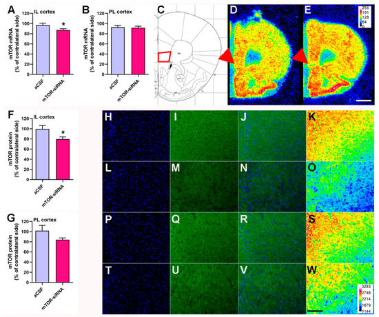 mTOR downregulation after intracerebral administration of siRNAs targeting mTOR in the infralimbic cortex (C). mTOR levels in (A,F), the IL, and (B,G) the PrL cortex were evaluated by (A–E) in situ hybridization, and (F–W) mTOR protein expression by immunofluorescence, after unilateral infusion into the IL cortex. Data are expressed as mean ± S.E.M. Unpaired Student’s t-test, * p < 0.05. n = 4–5 animals per group. Representative coronal brain sections containing IL cortex showing mTOR mRNA expression in (D) aCSF-infused and (E) mTOR-siRNA-infused mice as assessed by in situ hybridization. Representative immunofluorescent images of the mTOR protein levels in (H–K) the IL and (P–S) the PrL cortex of vehicle-infused mice, and in (L–O) the IL and (T–W) the PrL cortex of mTOR-siRNA-infused mice. Images show (H,L,P,T) DAPI, (I,M,Q,U) mTOR, (J,N,R,V) merged, and (K,O,S,W) heat-map image. Scale bar in E: 1 mm. Scale bar in W: 100 µm. Heat-map calibration bar in E and W showing the intensity values. aCSF: artificial cerebrospinal fluid; IL: infralimbic; PrL: prelimbic; siRNA: small interfering RNA.