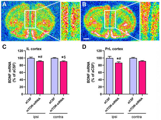 Given that brain BDNF levels are critical in the neurobiology of MDD, as well as in the antidepressant effects [45,46], we also examined the BDNF expression in the intra-IL mTOR knockdown mice. Moreover, as the mTOR-siRNA was infused in the IL cortex unilaterally, we also considered the brain side as a variable. mTOR knockdown in the IL cortex produced a significant reduction of BDNF mRNA expression in both brain sides (ipsi- and contralateral IL cortices) (Figure 3B,C), and in the ipsilateral PrL cortex (Figure 3B,D) 48 h post-infusion. Two-way ANOVA analyzing the effect of the treatment and the brain side factors revealed a significant effect of treatment on the BDNF expression in the IL cortex (F(1,16) = 26.41, p < 0.001) (Figure 3C), and in the PrL cortex (F(1,16) = 13.65, p < 0.01) (Figure 3D).