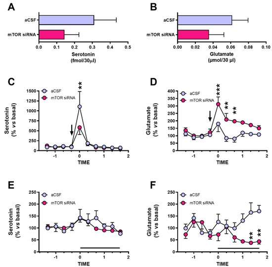 Dysregulation of extracellular serotonin and glutamate neurotransmitters in the dorsal raphe nucleus after acute infralimbic-mTOR knockdown in mice. Baseline extracellular values of (A) serotonin and (B) glutamate in DRN. The effects of local 50 μM veratridine on extracellular (C) serotonin and (D) glutamate levels, and intra-DRN 100 μM NBQX infusion on extracellular (F) 5-HT and (E) glutamate levels in control and mTOR-siRNAs mice. Data are represented as mean ± SEM. Two-way ANOVA followed by Bonferroni post hoc test (** p < 0.01, *** p < 0.001). n = 4–5 animals per experimental group. 5-HT: serotonin; aCSF: artificial cerebrospinal fluid; NBQX: 2,3-dihydroxy-6-nitro-7-sulfamoyl-benzo(f)quinoxaline; siRNA: small interfering RNA.