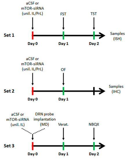 Experimental schedule of the different experimental procedures performed in this study. mTOR-siRNA or vehicle (aCSF) was unilaterally infused in the IL or PrL cortices for the behavioral experiments (sets 1 and 2), and in the IL cortex for the microdialysis studies (set 3). Samples were collected 48 h post-infusion (2 h after the last behavioral test for set 1). aCSF: artificial cerebrospinal fluid; siRNA: small interfering RNA; unil.: unilateral infusion; IL: infralimbic cortex; PrL: prelimbic cortex; DRN: dorsal raphe nucleus; FST: forced swimming test; TST: tail suspension test; OF: open-field test; ISH: in situ hybridization; IHC: immunohistochemistry; MD: microdialysis; Verat.: vetridine; NBQX: 2,3-dihydroxy-6-nitro-7-sulfamoyl-benzo(f)quinoxaline.