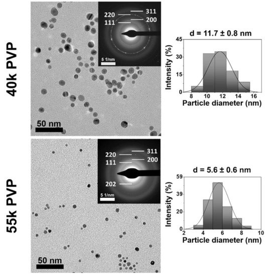 The morphological properties of the synthesized AgNPs are presented in Figure 1 with the corresponding TEM images, electron diffraction patterns, and their respective particle size distribution histograms. Both PVP-utilizing reactions resulted in spherical nanoparticles. The smaller molecular weight (MW) PVP-stabilized system yielded larger particles, around 12 nm, while the larger molecular weight system generated smaller particles of about 6 nm diameter in accordance with the relevant literature. In their contribution, Madkour et al. proposed that during nanoparticle synthesis, one end of the stabilizing polymers may attach to the forming particles, while the rest of the chain forms a loose adsorbate layer around them [20]. The degree of coverage around the particles increases with polymer molecular weight, thus inhibiting further Ag+ reduction on the surface to a higher degree, resulting in smaller particles compared to systems utilizing smaller MW stabilizers, where the particles have a larger free surface, rendering particle growth possible. The sample prepared with 40k PVP demonstrated prominent Debye-Scherrer rings, corresponding to 2.35 and 1.44 Å lattice distances, or Miller indices of (111) and (220), respectively; to a smaller degree, rings corresponding to (220) and (311) were detected, verifying the chemical composition of the particles [8,18,21,22]. AgNPs synthesized by 50k PVP also demonstrated these rings, although in a much more diffuse manner, due to their smaller particle size. Furthermore, an additional ring appeared, which, according to the Inorganic Crystal Structure Database (ICSD), corresponds to the (202) crystal facet of silver oxide (2.73 Å), demonstrating the somewhat reduced chemical uniformity of silver nanoparticles stabilized through 50k PVP [23].