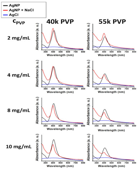 According to the literature and our previous results, the characteristic surface plasmon peaks of silver nanoparticles can undergo various changes due to interfering agents in the liquid media [16,18,24]. Their λmax may redshift due to surface interactions, and their absorbance intensities can decrease with aggregation [25,26]. However, the results in Figure 2, describing the effect of NaCl on silver nanoparticles stabilized by various concentrations of PVP, cannot be explained by the above-mentioned phenomena. Each spectrum, corresponding to AgNP samples mixed with 100 mM NaCl, demonstrated slight SPR blue shifts and absorbance increases at the local minima around 325 nm compared to the untreated AgNP samples. Blue shifts may occur due to a decrease in nanoparticle diameter, while the intensity increase of the absorbance valley can be explained by the formation of AgCl precipitation [24,27].