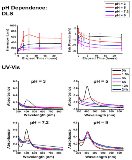 The effect of pH on the aggregation behavior of PVP-stabilized silver nanoparticles. Dynamic light scattering (DLS) results (top) are represented as average hydrodynamic diameter (Z-average) and zeta potential changes; UV–Vis absorbance spectra (bottom) of PVP-stabilized silver nanoparticles taken over 24 h under various pH values.