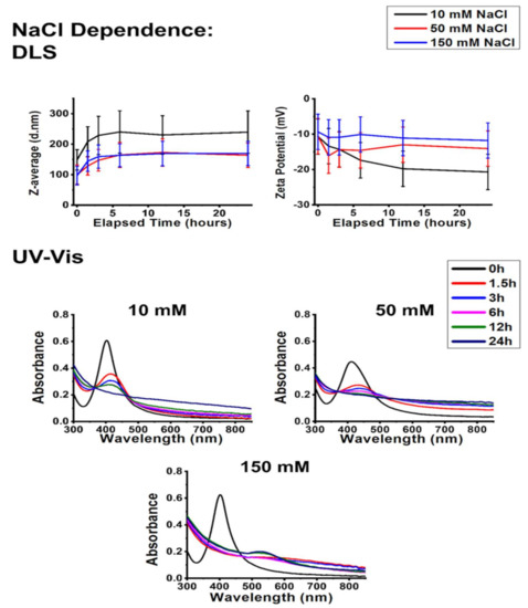 The effect of physiological NaCl concentrations on the stability of AgNP@PVP. Average hydrodynamic diameter (Z-average) and zeta potential changes (top panels) obtained by dynamic light scattering (DLS) and UV–Vis absorbance spectra (bottom panels) of polyvinyl-pyrrolidone-stabilized silver nanoparticles, recorded under various NaCl concentrations over a 24-h timeframe.