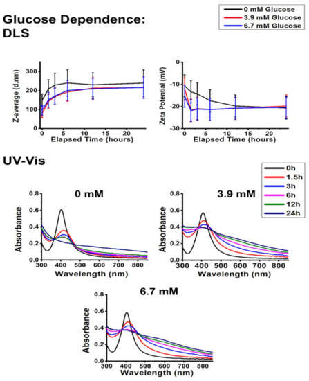 Dynamic light scattering (DLS) results (top), represented as average hydrodynamic diameter (Z-average) and zeta potential changes, and UV–Vis absorbance spectra (bottom) of polyvinyl-pyrrolidone-stabilized silver nanoparticles over 24 h under physiological glucose concentrations.