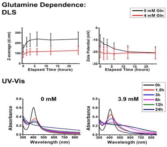 The presence of glutamine affects the stability of polyvinyl-pyrrolidone-stabilized silver nanoparticles. The average hydrodynamic diameter (Z-average) and zeta potential values were assessed by dynamic light scattering (DLS) (top) and UV–Vis absorbance spectra (bottom) of AgNP@PVP, recorded over 24 h in the presence of glutamine.