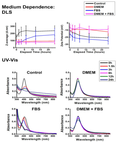 In this section, the effect of two different cell culture components, Dulbecco’s modified Eagle’s medium (DMEM) and fetal bovine serum (FBS), was investigated on nanoparticle aggregation. From a chemical standpoint, DMEM can be considered a complex salt solution, and FBS a mixture of various biomolecules, overwhelmingly proteins [40]. Recognizing these solutions as chemically similar analogs for an environment of differing NaCl concentrations, tested previously, and another environment containing biomolecules such as glucose/glutamine, also examined in the preceding experiments, the data gathered here can be easily compared with the results described above in the manuscript.