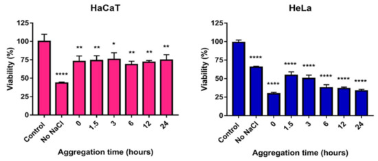 The effect of nanoparticle aggregation on the cytotoxicity exhibited on immortalized human keratinocyte (HaCaT) cells and human cervical cancer (HeLa) cells. Increasing aggregation states of PVP-stabilized silver nanoparticles were created by incubating the particles with 150 mM NaCl for different time periods (0, 1.5, 3, 6, 12, and 24 h) prior to cell treatments. The statistical significance of the experiments was calculated through unpaired t-tests and are marked with * (p ≤ 0.05), ** (p ≤ 0.01), and **** (p ≤ 0.0001).