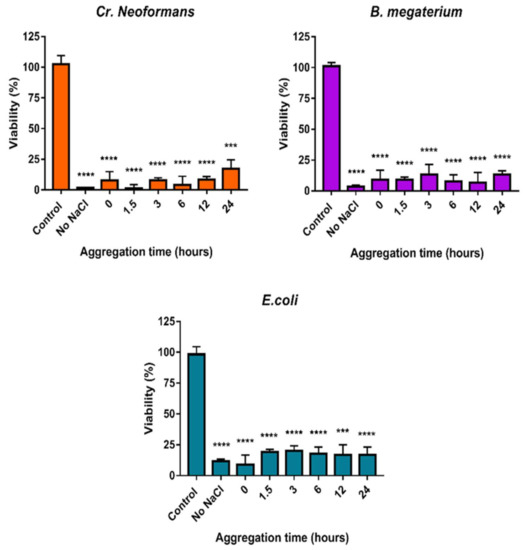 The effect of nanoparticle aggregation on the antimicrobial activity against Cr. neoformans, B. megaterium, and E. coli. Increasing aggregation degree was achieved by incubating the particles with 150 mM NaCl for different time periods (0, 1.5, 3, 6, 12, and 24 h) prior to treatments. The statistical significance of the experiments was calculated through unpaired t-tests and are marked with *** (p ≤ 0.001), and **** (p ≤ 0.0001).