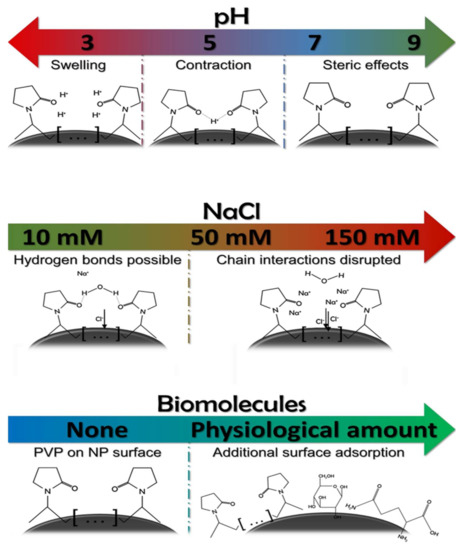The effect of environmental conditions on the steric stabilization of silver nanoparticles protected by polyvinyl pyrrolidone.