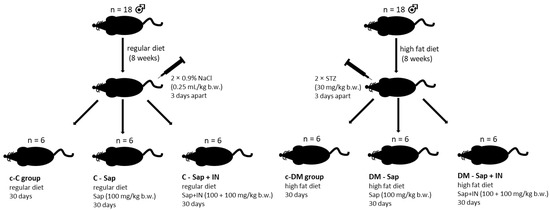 Thirty-six male Sprague–Dawley (SD) rats were obtained from Animalab (Germany) aged 9–10 weeks. Animals were kept in 12–hour light/darkness cycles in a temperature-controlled environment. All animals were acclimatized for one week on a standard diet before grouping. After that period, the rats were randomly divided into two main groups. Animals of the control group (C; n = 18 rats) were fed with a regular diet, and rats of the high-fat diet group (HFD; n = 18) were fed with a high-fat diet (previously described [25]) to induce insulin resistance. All animals of both groups (C and HFD) were kept in plastic cages (3 rats per cage) and had ad libitum access to water and adequate chow until the end of the experiment. Two months later, the rats were injected twice 3 days apart with: (A) HFD group streptozotocin (30 mg/kg b.w.) (STZ; Sigma-Aldrich) to induce type 2 diabetes (DM group) [25]; (B) control group (c-C group) was injected with 0.9% NaCl in a dose volume of 0.25 mL/kg. Before the second injection, blood glucose levels were tested. Rats with a glucose level greater than 16.67 mmol/L did not receive the second injection. Next, animals of both groups were randomly divided into subgroups (n = 6): 3 subgroups of the non-diabetic group (C) control (C); saponins (100 mg/kg) treated rats (C-Sap); rats treated with saponins (100 mg/kg b.w.) + inulin (100 mg/kg) (C-Sap + IN), and 3 subgroup of STZ-treated rats diabetic group (DM): control (c-DM); saponins (100 mg/kg b.w.)-treated rats (DM-Sap); rats treated with saponins (100 mg/kg b.w.) + inulin (100 mg/kg) (DM-Sap + IN). Substances (saponins and inulin) were administered per os for 30 days, once per day in the form of small pellets made of saponins or saponins + inulin and pressed into a piece of bread. The rats of both control subgroups (c-C and c-DM) received pellets made solely of bread. At the end of the experiment, the animals were terminated under morbital anesthesia (2 mL/kg b.w.) after 12–14 h of fasting. The blood was taken directly from the heart and glycated hemoglobin (HbA1c/HbF), and a lipid blood test was performed. The experiment was approved by the Local Ethical Committee on Animal Testing in Poznań, Poland (approval no. 60/2016). The schema of the experiment is shown in Figure 1.