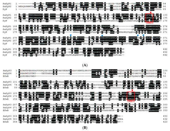 Whole-genome sequencing showed that S. avermitilis has four candidate DyP-type peroxidase genes [26]. Two of these, SavDyPr03-1 (SAV_549) and SavDyPrx03-2 (SAV_3599), encode proteins predicted to be class V (formerly class C in RedoxiBase) that we named SaDyP1 and SaDyP2, respectively [19]. A ClustalW-based amino acid sequence alignment of SaDyP1, SaDyP2 and DyP from B. adusta, a class V DyP-type peroxidase, is shown in Figure 1A. The amino acid sequences of SaDyP1 and SaDyP2 are quite similar, exhibiting 59.1% identity. On the other hand, the sequence identity with DyP is lower for SaDyP1 (27.2%) and SaDyP2 (28.3%). The remaining two genes, SAV_4242 and SAV_5925, are predicted to encode class I (formerly class A) proteins that we named SaDyP3 and SaDyP4, respectively. The amino acid sequence alignments of SaDyP3 and SaDyP4 with EfeB from E. coli, a Class I DyP-type peroxidase, are shown in Figure 1B. The amino acid sequence homology between SaDyP3 and SaDyP4 is 39.7%. SaDyP3 is a homologue of DtpA, a DyP-type peroxidase from S. lividans, and the two peroxidases show an amino acid sequence identity of 78.4%. The DyP-type peroxidase from Streptomyces coelicolor (PDB: 4GRC) is a SaDyP4 homologue, and these two enzymes exhibit an amino acid sequence identity of 85.6%. On the other hand, genes homologous to those encoding SaDyP1 and SaDyP2 do not exist in well-studied Streptomyces sp. such as S. lividans and S. coelicolor. Structure alignment of SaDyP1 model constructed by SWISS-MODEL and DyP (PDB: 3afv) was shown in Figure 1C. SaDyP1 has conserved aspartate D176, other conserved residues and unique GXXDG motif of DyP-type peroxidases. Comparison of the conserved amino acid residues around the heme, the positions of the residues were in reasonable correspondence between DyP and SaDyP1 models.