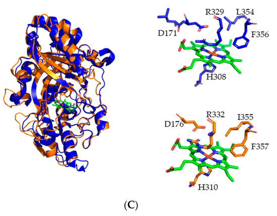 Heme peroxidases are conserved among almost all organisms and catalyze various oxidative reactions using hydrogen peroxide as an electron acceptor. They are present in both prokaryotes and eukaryotes and are classified by the peroxidase and oxide-reductase database RedoxiBase (https://peroxibase.toulouse.inra.fr/, accessed on 20 July 2021) into six groups [1,2]: catalases, haloperoxidases, di-heme cytochrome c peroxidases, animal peroxidases, non-animal peroxidases (previously called plant peroxidase [3]) and DyP-type peroxidases. Dye-decolorizing peroxidase (DyP; EC 1.11.1.19), a novel peroxidase isolated from the basidiomycete Bjerkandera adusta Dec 1 [4], is capable of degrading persistent anthraquinone dyes, in contrast with other types of peroxidases [5]. DyP differs from existing heme peroxidases in terms of amino acid sequence, tertiary structure, substrate specificity, catalytic residues and optimum pH. For these reasons, it was originally considered an exceptional peroxidase. However, DyP and a series of genes phylogenetically similar to DyP were proposed to constitute a novel heme peroxidase family, the DyP-type peroxidase because many genes similar to DyP were found, and for those cases in which the corresponding protein has been purified, their biochemical characterizations have been revealed similar to those of DyP [6,7].