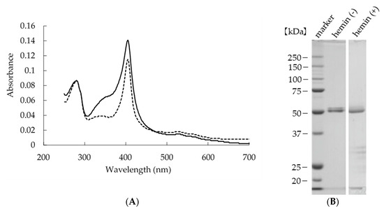 Purified SaDyP1 was resolved by sodium dodecyl sulfate-polyacrylamide gel electrophoresis (SDS-PAGE) and stained with Coomassie brilliant blue (CBB). Two bands appeared nearly 49.4 kDa, the predicted molecular mass of SaDyP1 with a 6 × His tag (Figure 2B). The N-terminal amino acid sequence of both bands contained the N-terminus of the SaDyP1 sequence. Therefore, the two bands are both derived from ectopically expressed SaDyP1. On the basis of these observations, we chose to use the SaDyP1 purified without hemin chloride for subsequent characterizations.