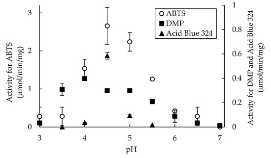 Optimal pH for the peroxidase activity of SaDyP1. Peroxidase activities against ABTS and DMP were measured between pH 3 and 7. Decolorizing activities against Acid Blue 324 were measured between pH 3.5 and 5.5 (n = 3). Open circle, ABTS; closed square, DMP; closed triangles, Acid Blue 324.