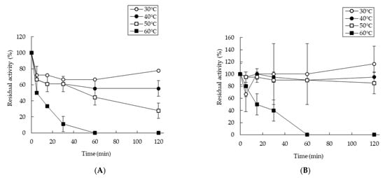 Thermostability of purified SaDyP1. SaDyP1 peroxidase activity toward ABTS (A) and DMP (B) at 30 °C after incubation at 30 °C, 40 °C, 50 °C or 60°C (n = 3). Residual activity at 0 h was defined as 100%. Open circles, 30 °C; closed circles, 40 °C; open squares, 50 °C; closed squares, 60 °C.