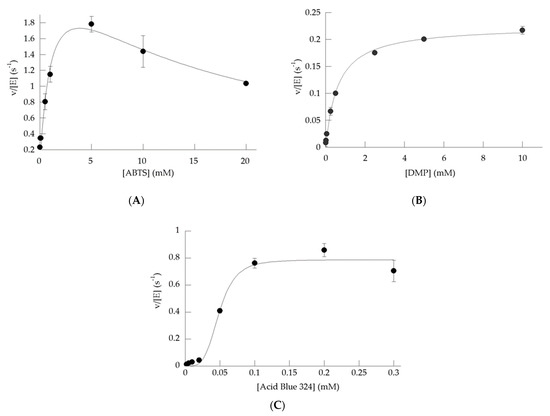 Substrate saturation curves of SaDyP1 for (A) ABTS at pH 4.5, (B) DMP at pH 4.0 and (C) Acid Blue 324 at pH 4.5 (n = 3). The plots were fitted to Haldane equation (ABTS), Michaelis-Menten equation (DMP) and Hill equation (Acid Blue 324).