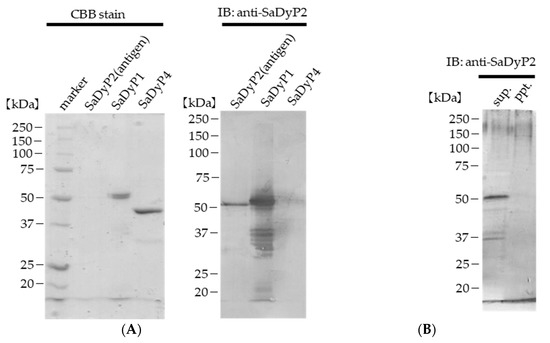 Cross-reactivity of an anti-SaDyP2 polyclonal antibody toward recombinant SaDyP1 and SaDyP4. (A) SDS-PAGE of SaDyP2 (antigen), SaDyP1 and SaDyP4, showing staining with CBB-G250 (left) and immunoreactivity to the anti-SaDyP2 antibody. (B) SDS-PAGE of S. avermitilis mycelium followed by immunostaining with anti-SaDyP2. sup., supernatant; ppt., precipitate.