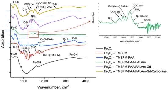 FTIR spectra of Fe3O4, Fe3O4-TMSPM, Fe3O4-TMSPM-PAA, Fe3O4-TMSPM-PAA/PALAm, Fe3O4-TMSPM-PAA/PALAm-Gd, Fe3O4-TMSPM-PAA/PALAm-Gd-Carborane.