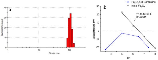 The size was examined by DLS analyses (Figure 3). By DLS analyses, the average hydrodynamical size is equal to 110 nm that differs from SEM results. However, it should be noted that size distribution obtained from SEM shows dry state of the sample, whereas DLS allows the sample to be observed in the solvated state where solvent molecules associate with particle []. Moreover, the system can exhibit the tendency to aggregation due to the attractive particle–particle interactions. Figure 3b shows a graph of the dependence of pH on zeta potential. The charge of initial Fe3O4 reverses from positive to negative at pH around 6.3, which can be considered an isoelectric point. The surface of Fe3O4 nanoparticles can form positive (Fe–OH2+) and negative (Fe–O−) surface charges. Fe3O4-TMSPM-PAA/PALAm-Gd-Carborane are negatively charged at pH values from 3.5 to 7.5. This can indicate that negatively charged carboxylic groups of grafted PAA are in excess.