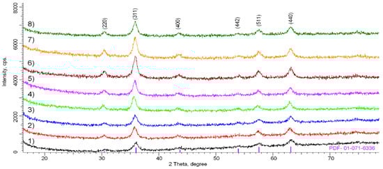 X-ray diffraction of Fe3O4 at different stages of modification: Fe3O4 (1), Fe3O4-TMSPM (2), Fe3O4-TMSPM-PAA (3), Fe3O4-TMSPM-PAA/PALAm (4), Fe3O4-TMSPM-PAA/PALAm-Gd (5), Fe3O4-TMSPM-PAA/PALAm-Gd-PAA (6), Fe3O4-TMSPM-PAA/PALAm-Gd-PAA/PALAm (7), Fe3O4-TMSPM-PAA/PALAm-Gd-PAA/PALAm-Carborane (8).
