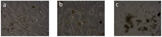 PC-3cells incubated with different concentrations of nanoparticles: 10 µg/mL (a), 50 µg/mL (b), 200 µg/mL (c).