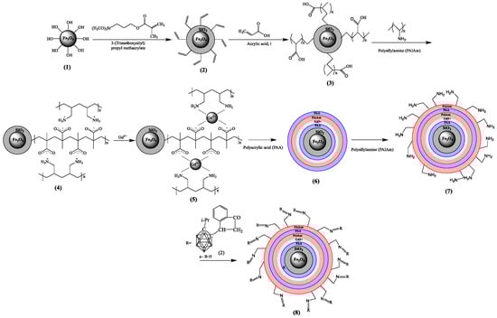 Scheme of Fe3O4 modification and carborane and gadolinium ion immobilization.