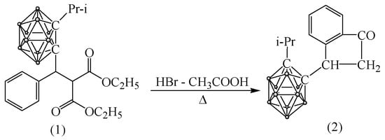 The interaction of carboranylmalonic ester (1) with a mixture of acetic and hydrobromic acids at 50–60 °C leads in good yield to 3-(isopropyl-o-carboranyl) hydrindone (2) (Scheme 2):