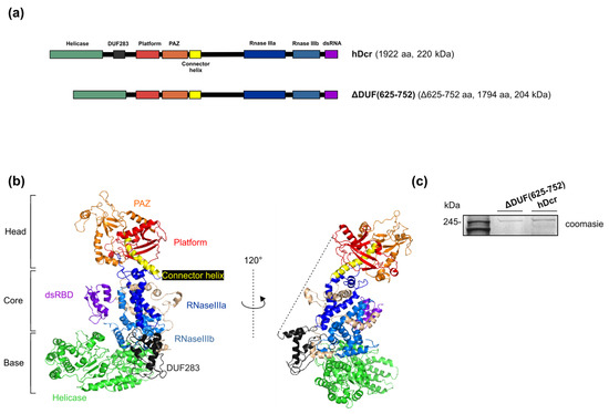 Full-length hDicer and its mutant lacking the DUF283 domain. (a) Schematic representation of hDicer domain architecture and the DUF283 domain deletion variant: ΔDUF(625-752). (b) The 3D structure of hDicer (PDB 5ZAL) visualized by PyMOL. The fragment removed in the ΔDUF(625-752) variant, i.e., DUF283 and the linker (missing in 5ZAL and drafted by the dashed line), is indicated in dark grey. (c) PAGE analysis of ΔDUF(625-752) and hDcr preparations. The C-terminally 3xFlag-tagged proteins were expressed in 293T NoDice cells, then they were purified by immunoprecipitation and analyzed by SDS-PAGE followed by Coomassie Blue Staining.