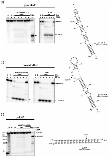 First, we tested the RNase activity of the ΔDUF(625-752) variant. The variant was assayed for the RNase activity using two pre-miRNA substrates: pre-mir-21 and pre-mir-16-1 and a 30-base pair (bp) RNA duplex having 2-nt 3′-overhanging ends (called “dsRNA”). The cleavage assays involved 18 nM of the protein and ~5 nM of either 5′-32P-labeled pre-mir-21, pre-mir-16-1 or dsRNA in which one of the two strands was 5′-32P-labeled. Thus, the reactions were performed under the low-turnover conditions, i.e., more than threefold molar excess of hDcr over a substrate was used. Two control reactions without the protein were also prepared: one containing only the substrate in the reaction buffer (C-) and the other containing the substrate in the reaction buffer with the addition of the Mg2+-chelating agent, EDTA (25 mM), (C+). As the Dicer cleavage activity is dependent on Mg2+, EDTA would abrogate this activity of Dicer. Thus, another control reactions included the substrate, protein and 25 mM EDTA (+EDTA). Yet another control contained the substrate and 18 nM hDcr. All reactions were carried out at 37 °C and then they were halted by adding 1 volume of 7 M UREA loading buffer and heating for 5 min at 95 °C. Reaction mixtures were separated on a 15% polyacrylamide gel with 7 M urea and 1xTBE (PAGE) and visualized by phosphorimaging (Figure 2). The cleavage assays were conducted in triplicate.