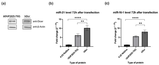 The aforementioned experiments were carried out under the in vitro conditions, consequently we asked the question about the ability of the ΔDUF(625-752) variant to process pre-mir-21 and pre-mir-16-1 under in cellulo conditions. By applying the RT-qPCR approach, we assessed the relative level of miR-21-5p and miR-16-1-5p produced in 293T NoDice cells expressing the ΔDUF(625-752) variant. As a negative control, we used 293T NoDice cells treated only with a transfection reagent and as a positive control, we used 293T NoDice cells transfected with the plasmid expressing the wild-type full-length hDicer, hDcr. All cells were harvested 72 h after transfection. We found that, under similar protein expression levels (Figure 3a), both miR-21-5p and miR-16-1-5p were less abundant in 293T NoDice cells expressing ΔDUF(625-752), than in 293T NoDice cells expressing hDcr (Figure 3b,c). Precisely, a reduction in miRNA level was by about 40% (for miR-21-5p) and by about 30% (for miR-16-1-5p) compared to the respective positive control reactions. Thus, we found that miR-21-5p and miR-16-1-5p were produced with different efficiency, depending on the used system: in vitro (Figure 2a,b) or in cellulo (Figure 3b,c).