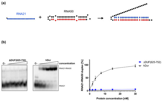 To investigate how removing the DUF283 domain from hDicer influences its RNA-RNA base pairing activity, we carried out the annealing assay involving a pair of complementary RNAs: 21-nt RNA (RNA21) and a 50-nt RNA (called “RNA50”) adopting a hairpin structure and containing the fully complementary RNA21 target site, schematically described in Figure 5a. This pair of complementary RNAs was used in our earlier annealing assays [24]. Before the reaction, RNA50 was incubated at 95 °C for 5 min and then slowly cooled to room temperature to ensure proper folding. Then, RNA50 was mixed in annealing buffer with 5′-32P-labeled RNA21 at a molar ratio of approximately 1:1 and incubated for 30 min with increasing amounts of ΔDUF(625-752) (1.88, 3.75, 7.5, 15, 30 nM) at 37 °C (Figure 5b). The same set of reactions was carried out for hDcr. Spontaneous annealing was determined by excluding the enzyme in the assay mixture (control reaction (C-)). Based on the results obtained from three independent experiments, for each reaction we calculated the percentage ratios between the fraction containing the RNA21-RNA50 duplex and the free RNA21 fraction. The average percentage content of the RNA21-RNA50 duplex was plotted against the protein concentration (Figure 5b, right panel). The collected results demonstrated that, in contrast to hDcr, ΔDUF(625-752) did not support base pairing between RNA21 and RNA50 under the applied reaction conditions. Neither we observed the RNA-RNA base pairing activity for the ΔDUF(630-709) variant (Figure S2). Altogether, collected data strongly support our hypothesis that the DUF283 domain is indispensable for hDicer RNA-RNA annealing activity.